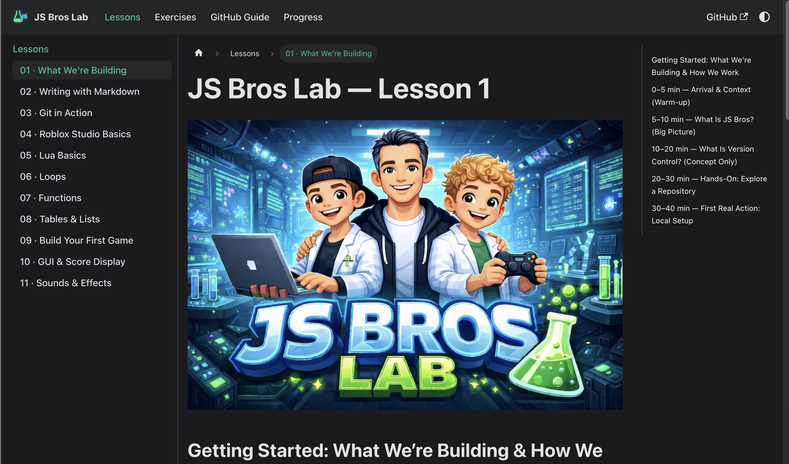 A coding curriculum built for kids 9-13, taught by Dad. Learn Git, Markdown, Roblox Studio, and Lua one lesson at a time.